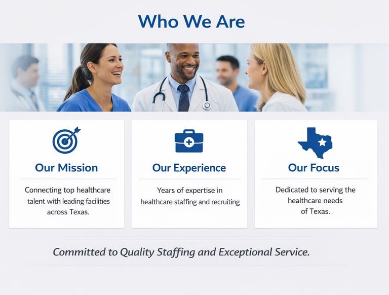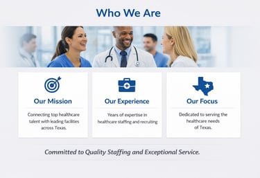 We are committed to delivering reliable, high-quality staffing solutions that support patient care, empower medical talent, and strengthen the healthcare community through integrity, service, and strategic partnerships.